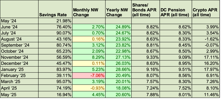 A new all-time high, albeit by a sliver. Markets have largely recovered from the orange man-child’s shenanigans and equities seem to be shrugging off the high level of country level debt (bond yields are starting to reflect this). I have relatively low exposure to bonds as a deliberate decision due to having a final salary pension scheme (albeit not being a current member for a long time). VRWL is not quite back up to where it was in February. Bitcoin has been having a good run as has gold as markets seem to like the look of anything that isn’t related to a government. As the owner of a few ‘altcoins’, Bitcoin dominance has been growing, so my overall crypto portfolio, although doing well, has had it’s performance tempered by this - the price of diversification.